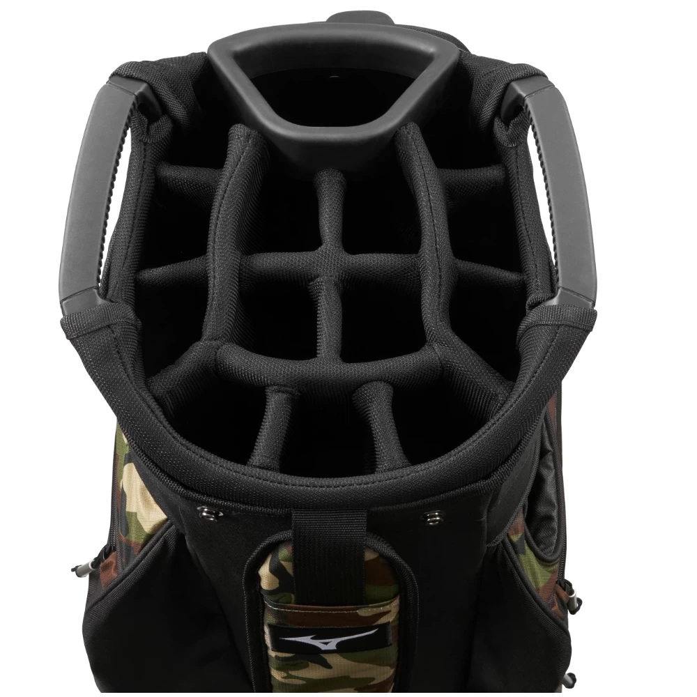 Mizuno BRD4C Bag Black is the new 2022 bag that Mizuno have launched. Its a great cart bag. It is their maximum storage cart bag with an incredible 15 pockets and bigger compartments so accommodates anything you could ever need on the course. Its really for the serious golfer because it carries such a lot or needs plenty of options. An integrated umbrella sleeve sits behind the main side pocket to keep clear from cart/trolley attachments.