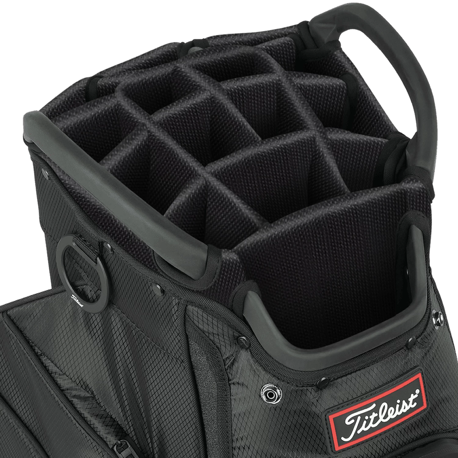 The Titleist Stadry 15 Cart bag has a large velcro patch for easy access to your golf glove and a padded single strap for comfort while carrying your bag during transport. Tour inspired handles on the cuff make it easy to place onto a trolley or cart because of thier easy to grab and durability. Waterproof construction along with outstanding organization and ample storage make the Stadry Cart 15 Bag an ideal fit for the dedicated golfer who prefers to ride and will play in any conditions.